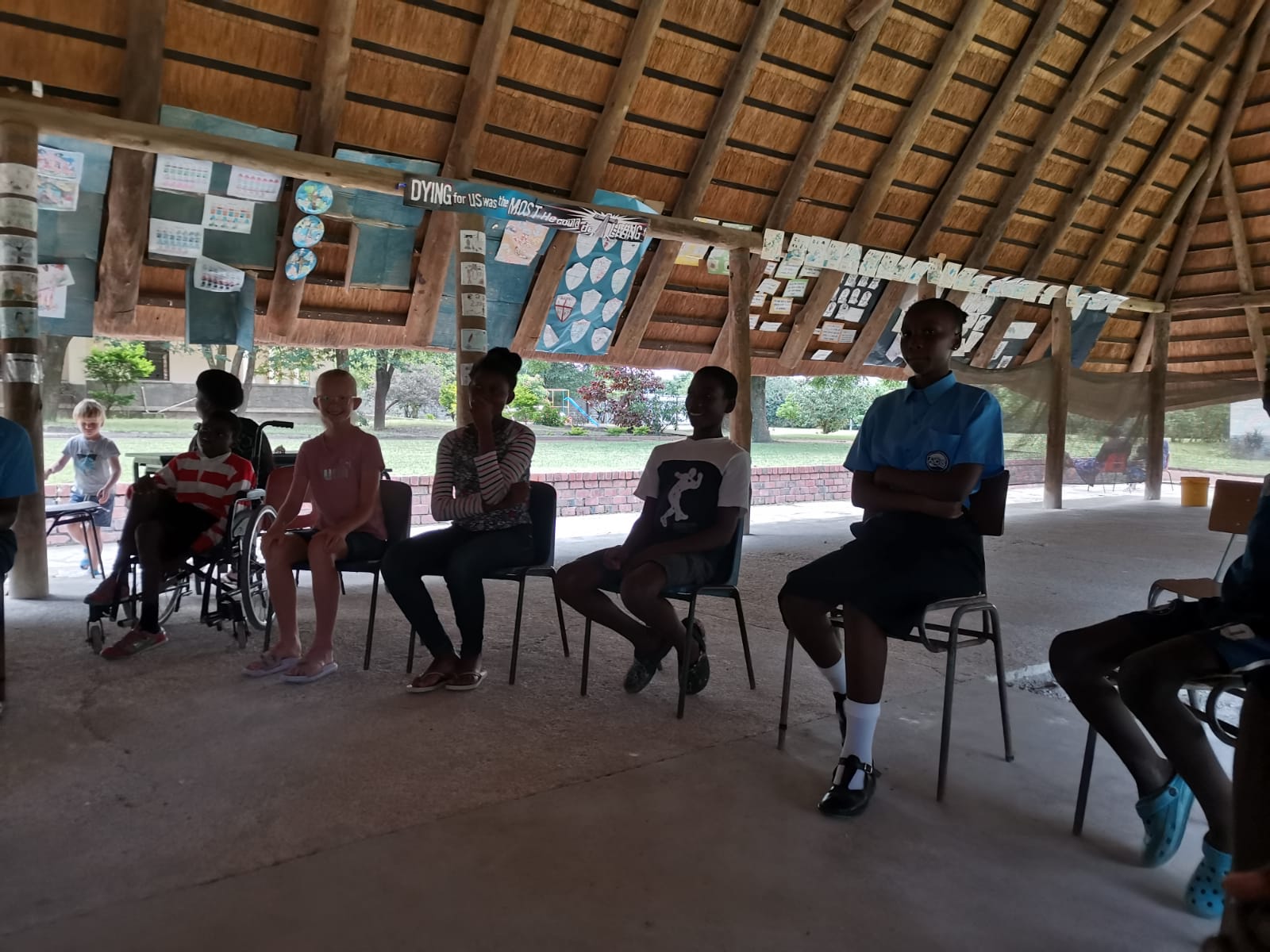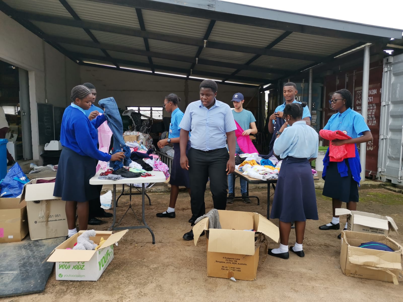 An einem Mittwoch ging es für uns zu einem zukünftigen Kinderheim, wo wir Säcke voller Kleider aus Australien sortierten, die dann in die Community an Bedürftige ausgeteilt wird.Zwei unserer Schüler mit Oncle Ben, der das Sortieren in die Hand genommen hatte.Bei der Arbeit, ein Schüler fand sogar ein Brautkleid.Gruppenbild nach der Arbeit.Im Kinderheim beim Spielenachmittag.Im Kinderheim beim Wickinger Schach spielendie kleinen mögen Kreisspiele