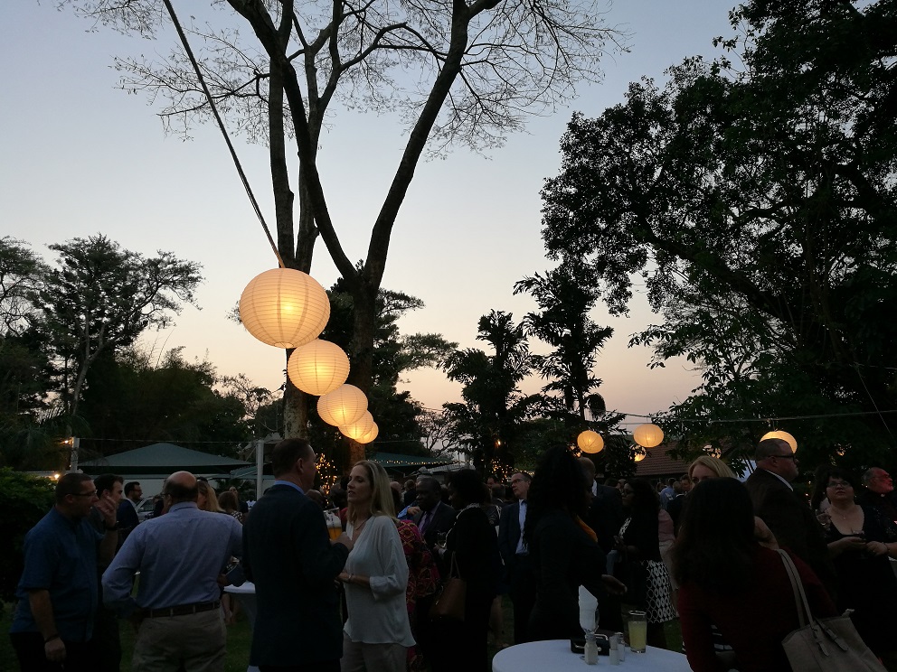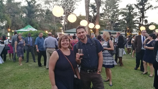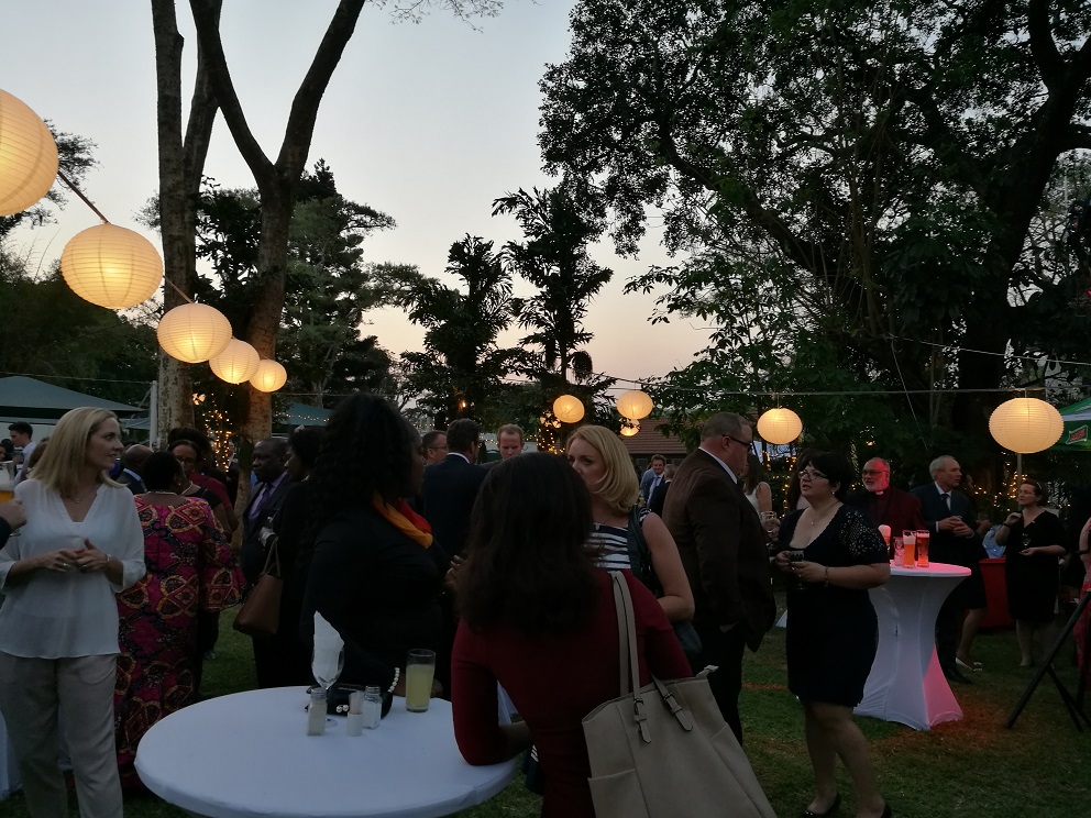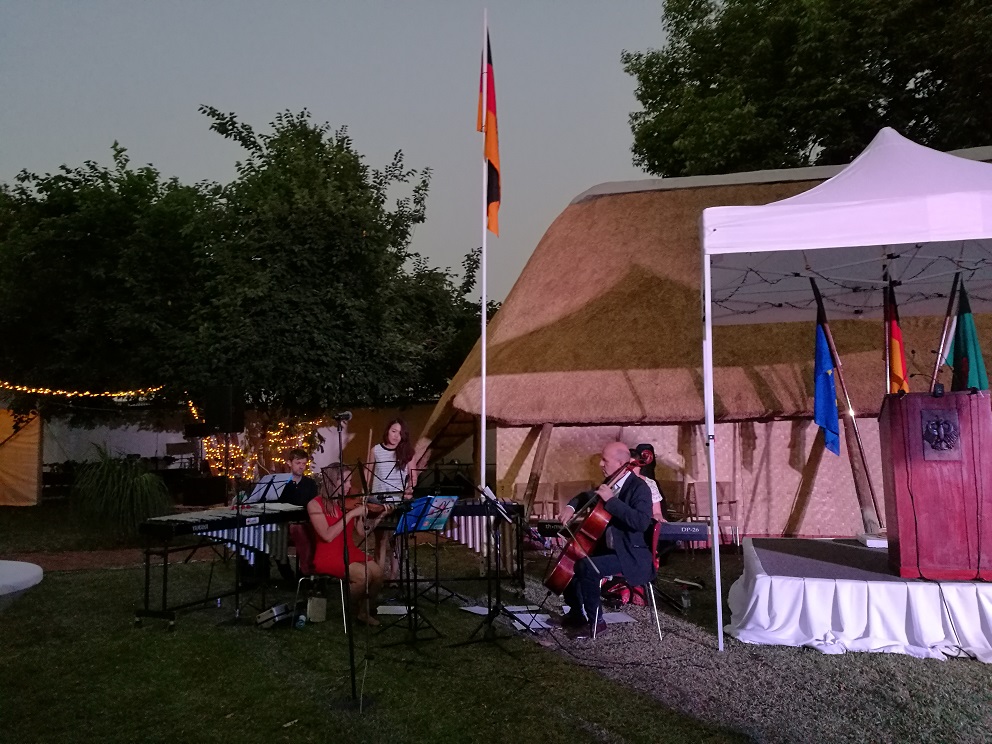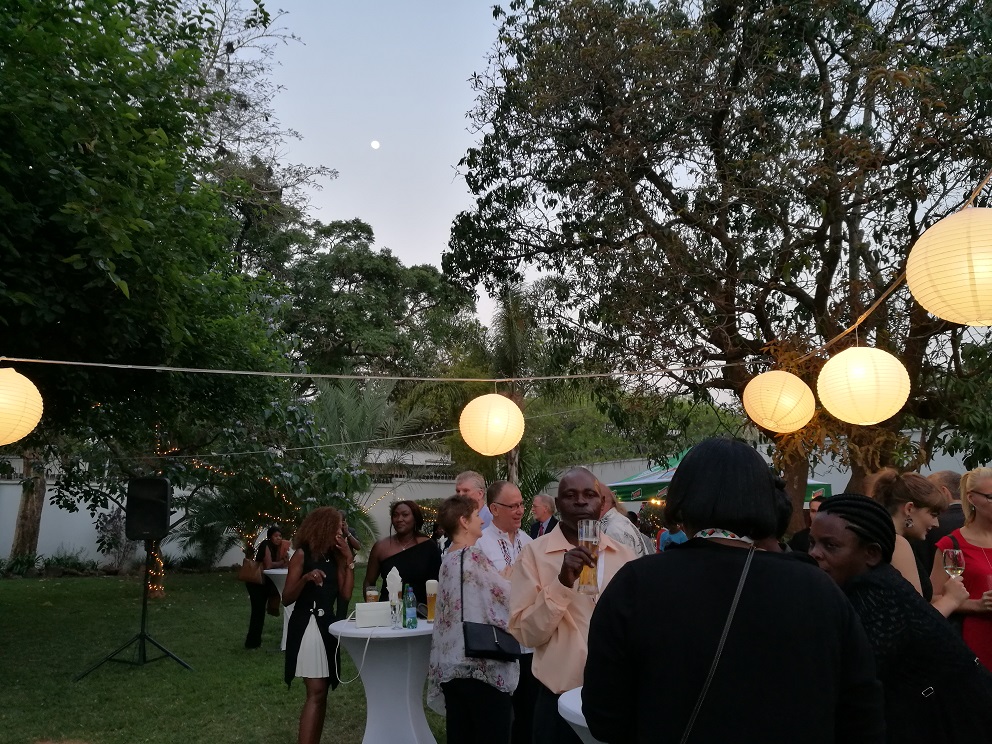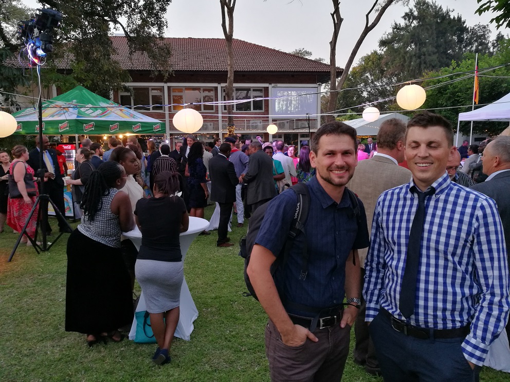An diesem Tag war auch zufällig der "Tag der deutschen Einheit". In Lusaka wurden darum alle Deutschen im Land von der Deutschen Botschaft zu einem Essen eingeladen. Dort gab es Leberkäse, Weißwürste, Kasseler, Sauerkraut und vieles mehr. Wir genossen ein Abend lang Livemusik, Reden aber vor allem auch, dass wir Manuel Sept wieder trafen, der momentan mit seiner Frau Carmen in Lusaka Sprache lernt (mit den beiden sind wir gemeinsam in Toronto gewesen und auch nach Sambia geflogen).