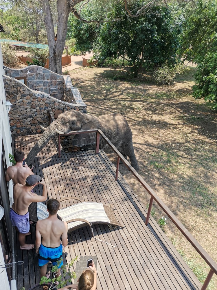 Ein besonders mutiger Besucher kam fast bis auf die Veranda des Hauses, um die grünen Pflanzen zu fressen. So nahe kommt man einem Elefanten selten.