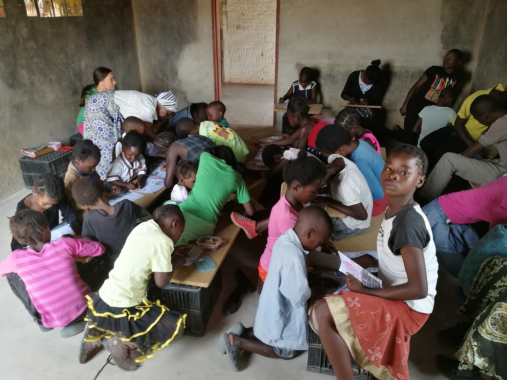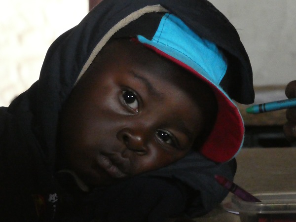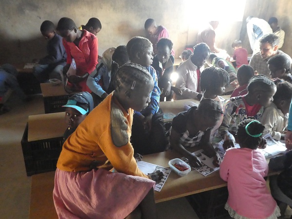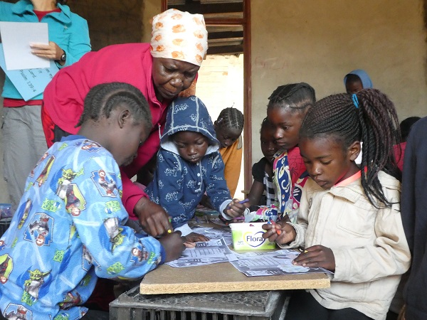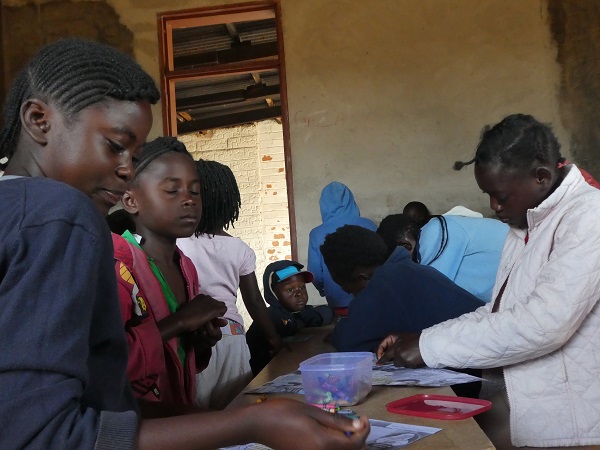 Morgens holen wir im Auto die Kinder aus Musenga ab - eine Woche dürfen die Jungs mitfahren, in der anderen Woche die Mädels.Hier warten schon immer die Kinder der Farm auf uns, auf der der Kidsclub in einem ausgeräumten Ziegenstall statt findet.Die Kinder dürfen sich Lieder wünschen, die wir gemeinsam acapella oder mit Gitarre singen.Dann erzählen wir die Bibelgeschichte mit Bildern. Immer mit dabei Ba Anna, die vom Englisch ins Bemba übersetzt.Die Kinder warten gespannt, was für eine Geschichte erzählt wird.Es wird neugierig zugehört.Hier wird gebastelt, immer passend zur Geschichte gibt es Fragen, ein Quiz oder Bilder zum AnmalenZwischen lachenden Kindergesichtern.