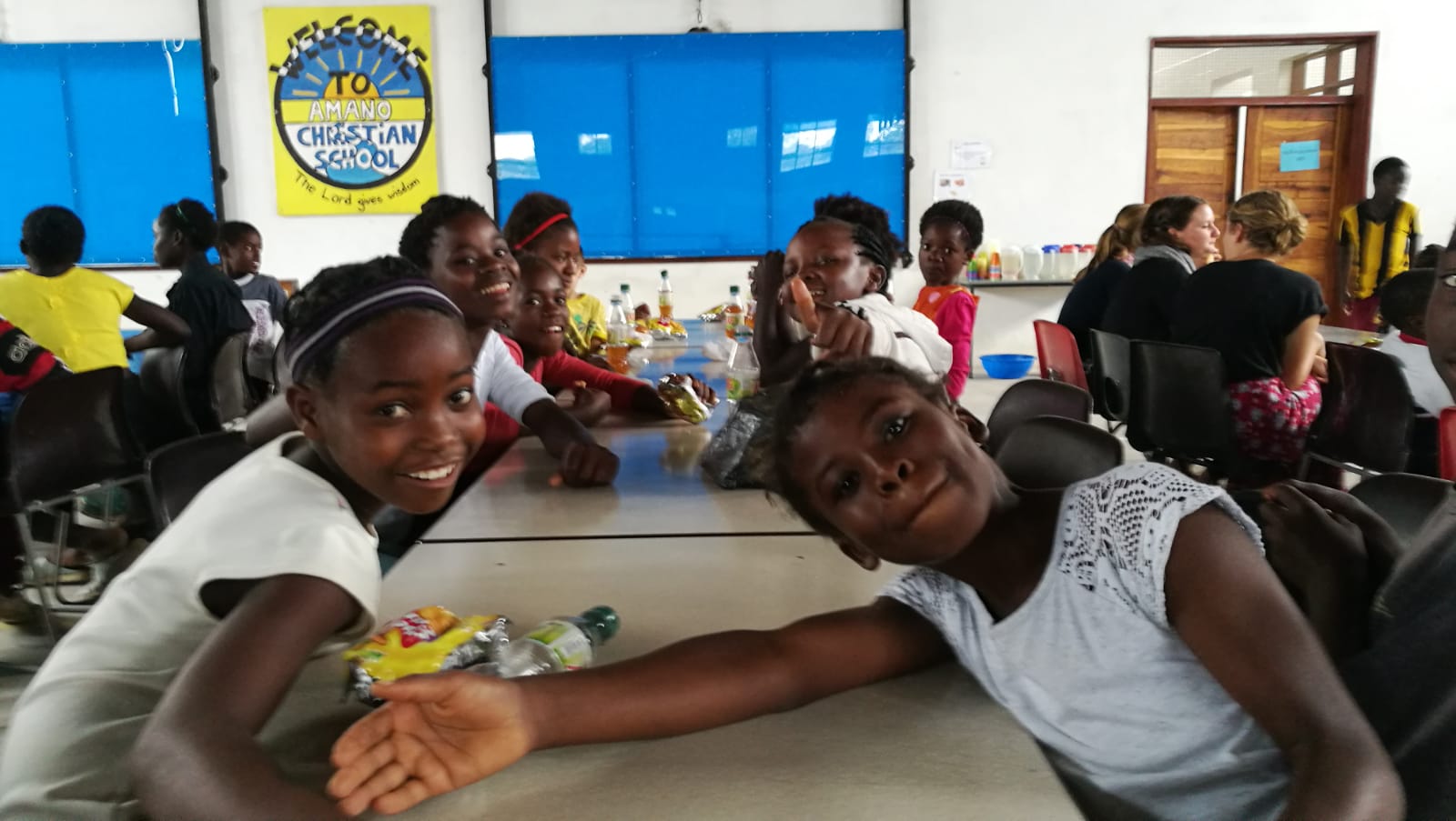 Vor kurzem hat er seinen "ehemaligen Kidsclub" besucht und daraus entstand die Idee einen gemeinsamen Kidsclub zu machen. So fragten Julia und ich in Amano an, ob wir die große Halle dazu benutzen dürfen. Denn momentan sind wir mitten in der Regenzeit. Unser Raum auf der Nachbarfarm wäre viel zu klein für die fast 100 Kinder und die Halle in Amano bietet viel Platz, ein Soundsysthem und außerdem ist es für die Kinder auch etwas besonders.
