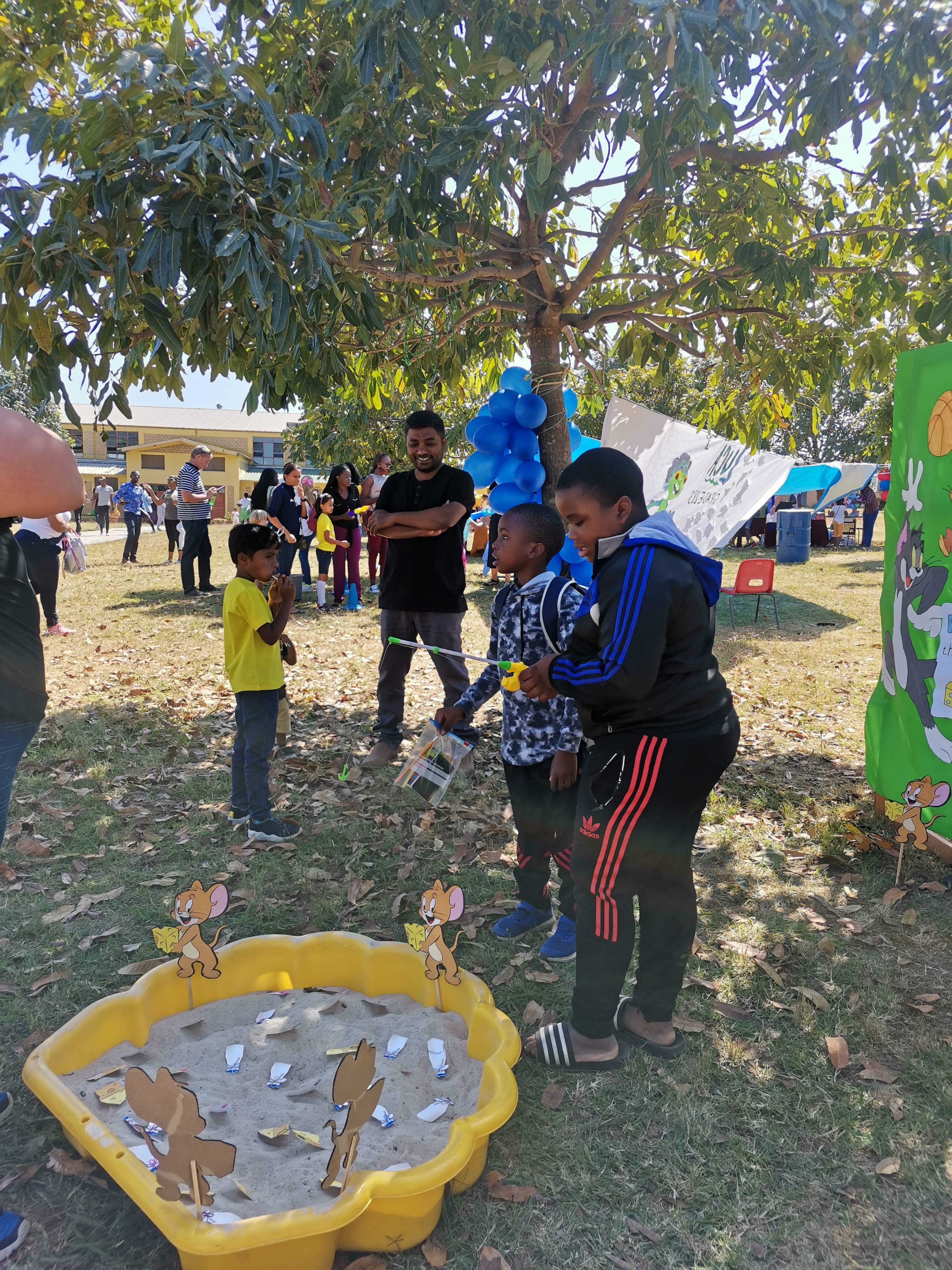 Außer der Schule können auch sämtliche Verkäufer von außen kommen. Es gab Tauziehen, eine Wasserschlacht, eine Hüpfburg für Groß und Klein und eine Wasserrutsche vom Termitenhügel.