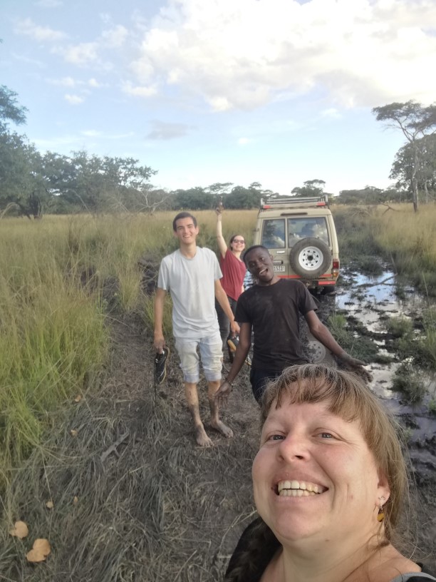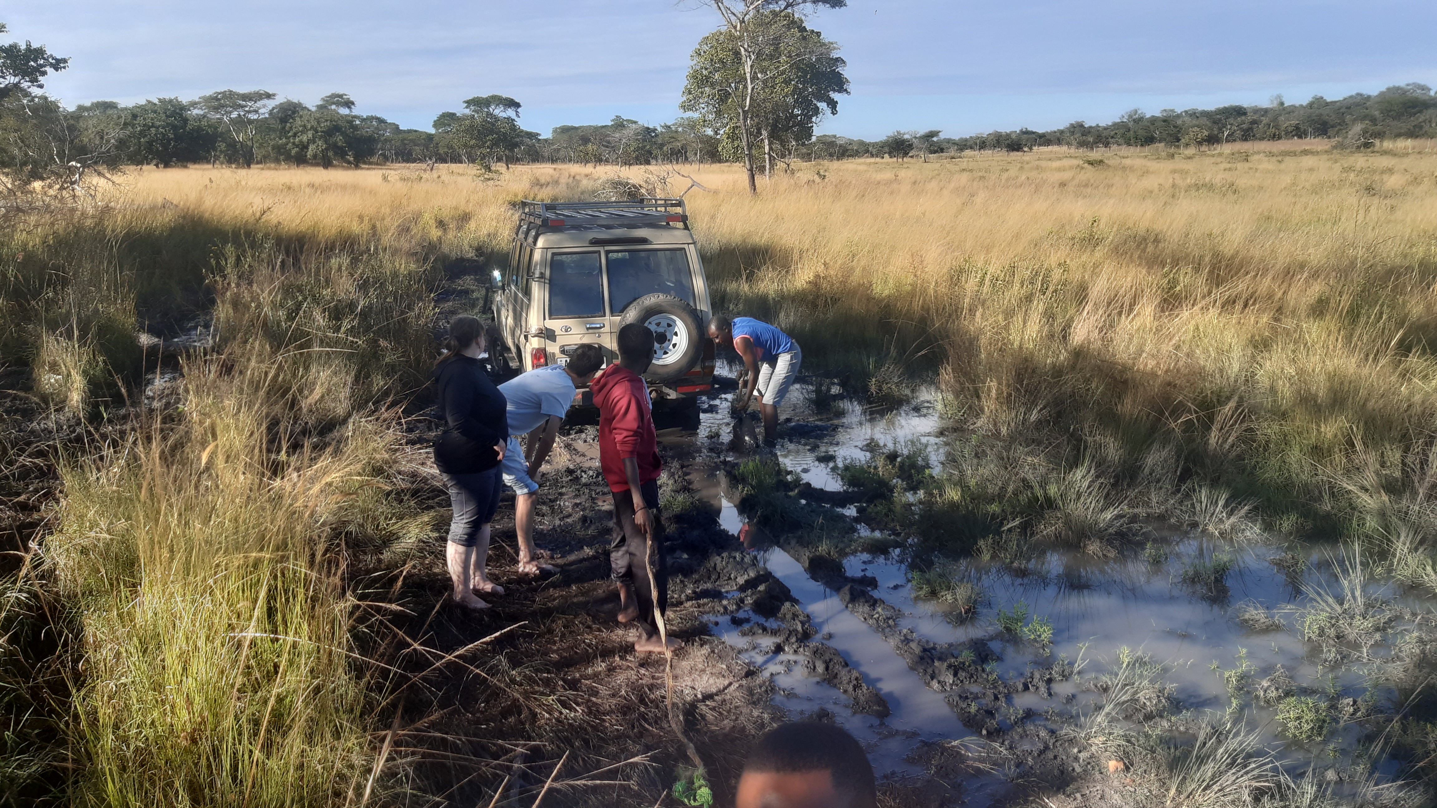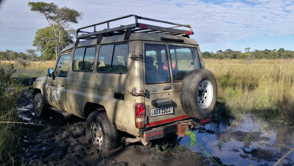 Nichts ging mehr voran. Alle vier reifen drehten durch, wir hatten die gerade beginnende Trockenzeit und den Landcruicer überschätzt. Leider waren wir so ziemlich am weitesten Punkt entfernt von unserem Camp. Wir probierten eine Stunde lang mit vereinten Kräften, standen alles fast Knietief im Matsch, suchten Äste, um unter die Räder zu legen, suchten Bäume (aber leider waren wir auf einer Ebene so konnten wir die Seilwinde nicht nutzen, geschweige denn hätten wir gewusst wie), versuchten es mit Mannespower. Keine Chance.