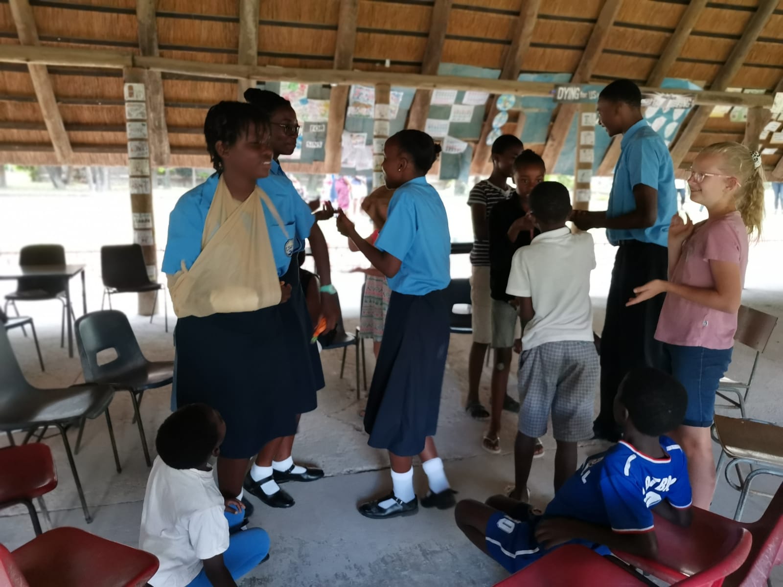 An einem Mittwoch ging es für uns zu einem zukünftigen Kinderheim, wo wir Säcke voller Kleider aus Australien sortierten, die dann in die Community an Bedürftige ausgeteilt wird.Zwei unserer Schüler mit Oncle Ben, der das Sortieren in die Hand genommen hatte.Bei der Arbeit, ein Schüler fand sogar ein Brautkleid.Gruppenbild nach der Arbeit.Im Kinderheim beim Spielenachmittag.Im Kinderheim beim Wickinger Schach spielendie kleinen mögen Kreisspiele