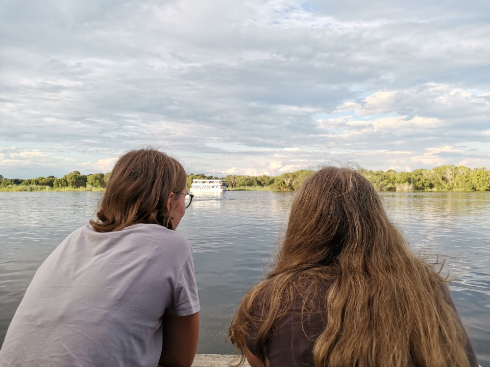 In Livingstone durften wir (obwohl wir nur Camper waren) die nahe Hotelterasse mit Blick auf den Zambesi Fluss benutzen und hatten so immer wieder wunderschöne Sonnenuntergänge oder unsere Stille Zeit am Morgen mit Hippo-Grunzen und Krokodilbegegnungen!