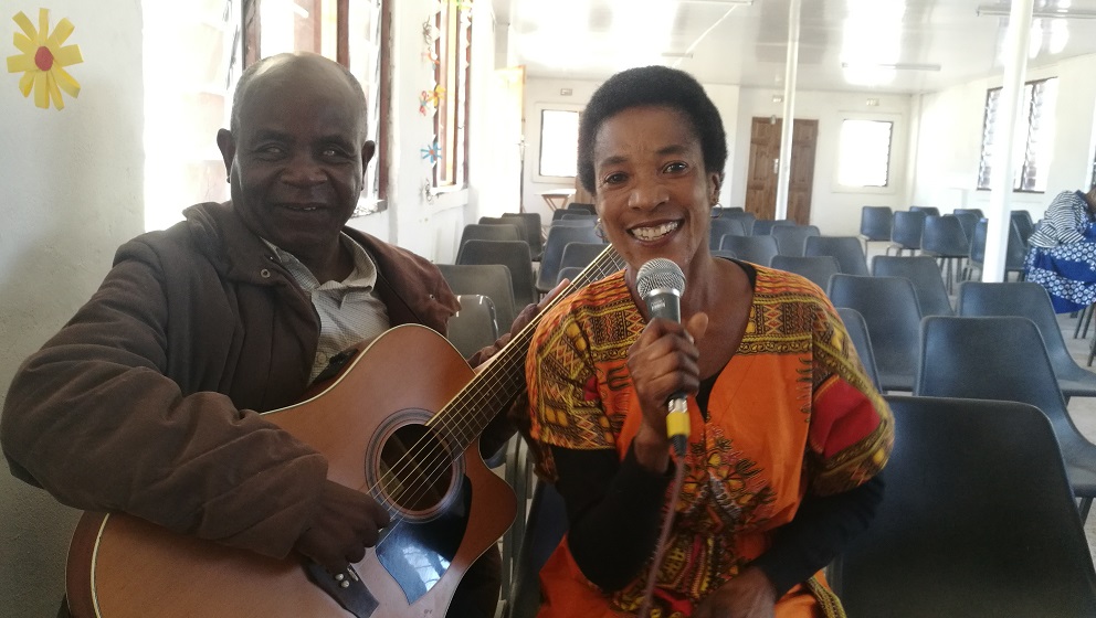 Meistens sind wir nicht alleine beim Musik machen, sondern bekommen Unterstützung von Linda und Shallove. Shallove spielt die Gitarre nach Gehör, denn er ist blind.