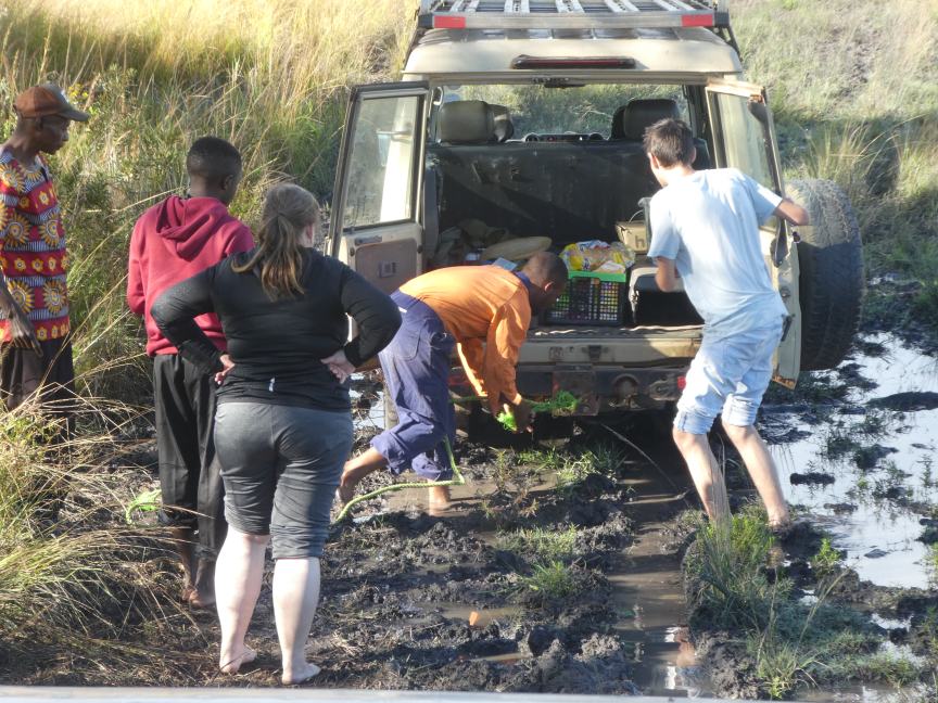Gesagt, getan, allerdings fing unser Rettungsfahrzeug auf einmal an zu spinnen. Die Kupplung hörte auf zu arbeiten und nach nur ein paar Zentimeter ging wieder nichts. Die einzige Idee war es mit gemeinsamer Körperkraft raus zu schieben. Und siehe da, vier Männer gemeinsam schafften es.