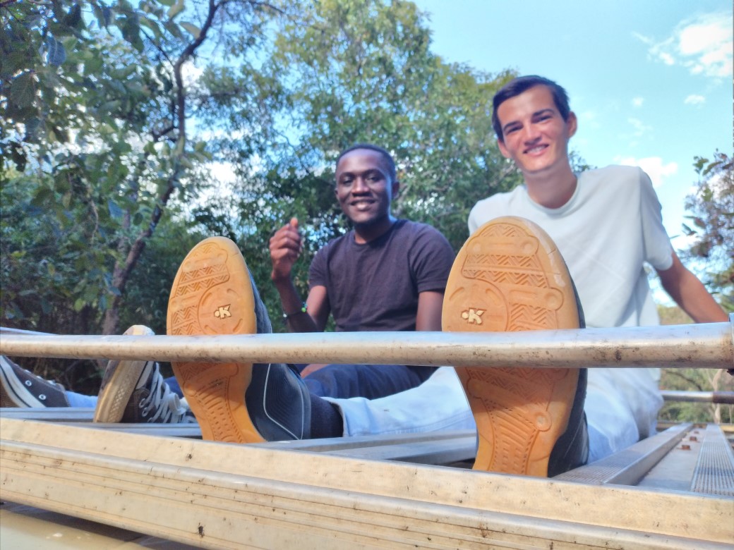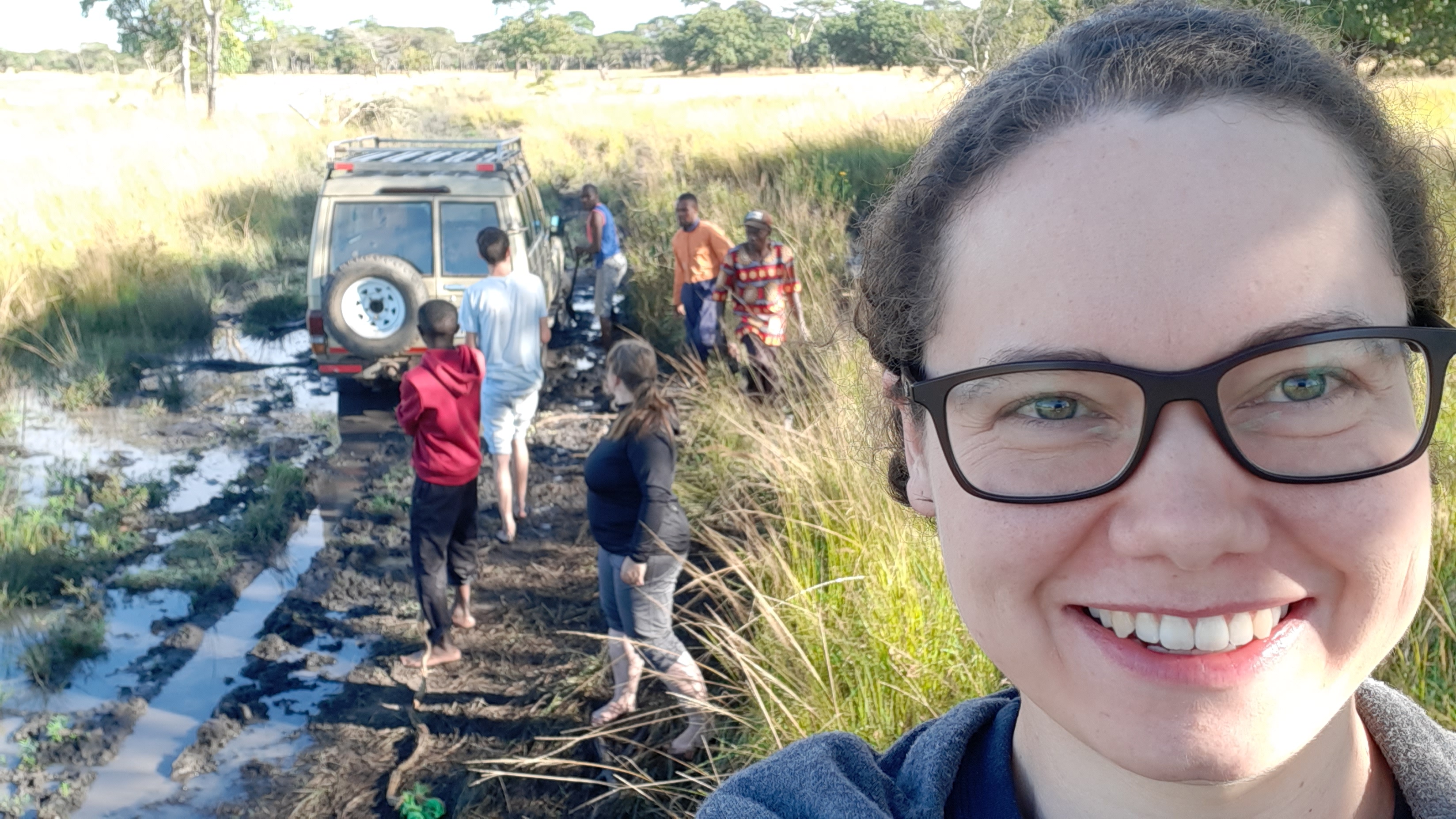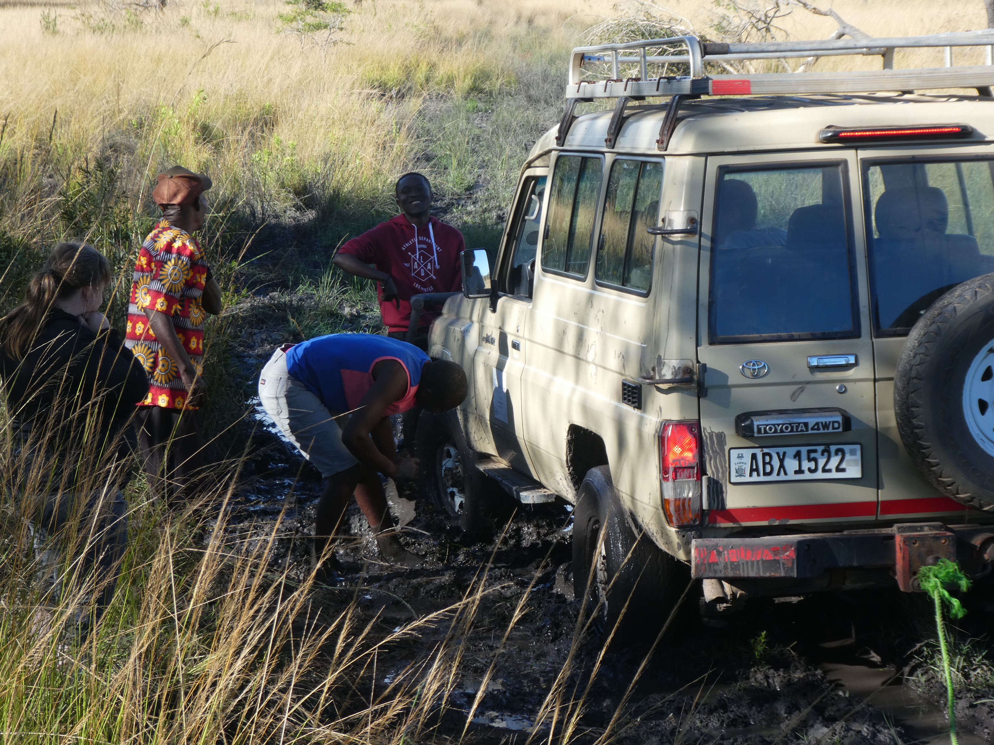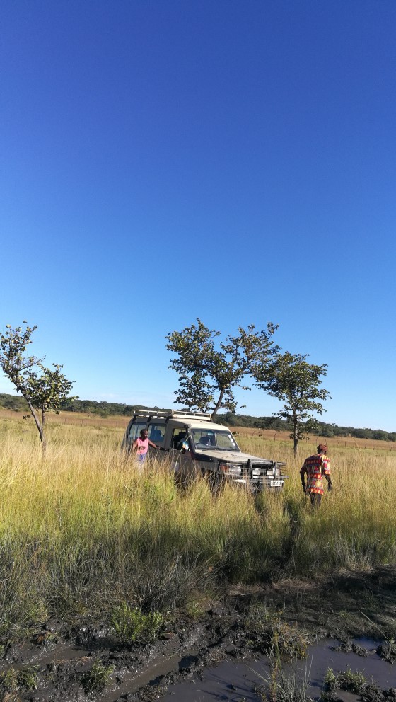 Nichts ging mehr voran. Alle vier reifen drehten durch, wir hatten die gerade beginnende Trockenzeit und den Landcruicer überschätzt. Leider waren wir so ziemlich am weitesten Punkt entfernt von unserem Camp. Wir probierten eine Stunde lang mit vereinten Kräften, standen alles fast Knietief im Matsch, suchten Äste, um unter die Räder zu legen, suchten Bäume (aber leider waren wir auf einer Ebene so konnten wir die Seilwinde nicht nutzen, geschweige denn hätten wir gewusst wie), versuchten es mit Mannespower. Keine Chance.